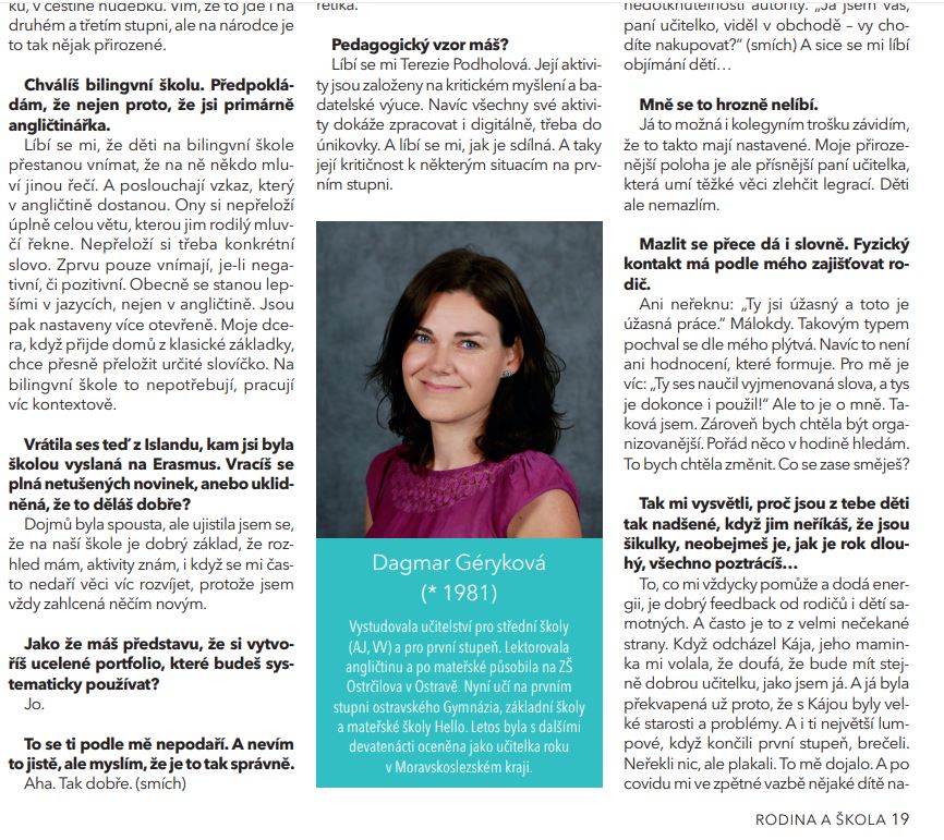Rozhovor s paní učitelkou Dagmar Gérykovou pro časopis Rodina a škola je krásným vhledem do života a práce naší oceněné učitelky roku. Příjemné čtení.